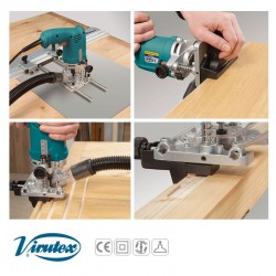 Diseñada para la realización de encajes para la posterior colocación de pernios o bisagras sin usar plantillas. Incorpora regulación milimétrica para una fácil regulación. También permite el perfilado de cantos en piezas canteadas y el fresado de ranuras en madera o materiales plásticos. Incluye de origen una base accesoria con copiador para fresar copiando usando plantillas. Equipada con toma para aspiración externa. Permite el ranurado de paneles compuestos (Alucobond® y similares) para su posterior doblado según necesidades (fresa opcional).